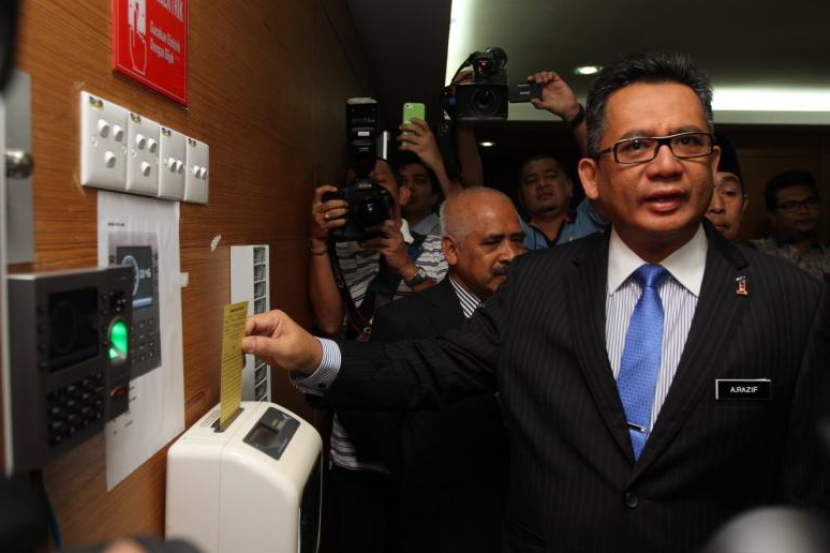 Ahmad Razif mengetip kad pada perakam waktu pada hari pertama beliau menjalankan tugas sebagai Menteri Besar Terengganu yang baharu di pejabatnya di Wisma Darul Iman, Kuala Terengganu pada Rabu. Foto ZABIDI TUSIN / THE STAR