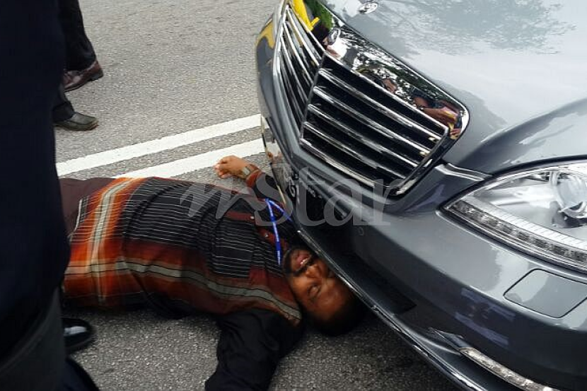 Beliau yang menunggu di luar DUN sejak pukul 12.30 tengah hari bertindak menahan kenderaan yang membawa Guan Eng kira-kira pukul 2 petang.