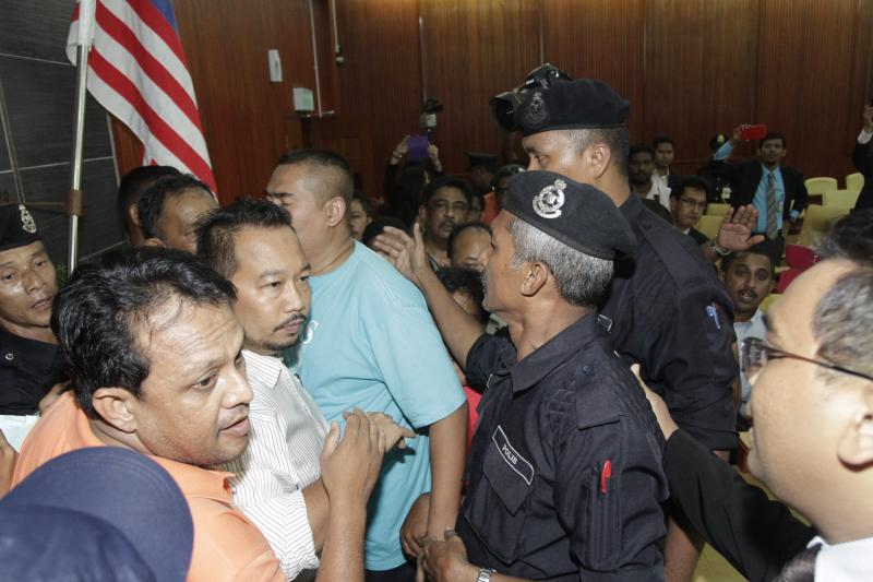 Insiden yang juga menyaksikan kumpulan berkenaan melemparkan telur ke pintu utama DUN itu menyebabkan kesesakan lalu lintas di Lebuh Light, di sini.