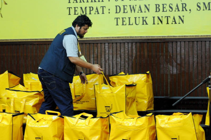 Kelihatan petugas Suruhanjaya Pilihan Raya (SPR) menyusun peti undi yang tiba di Pusat Penjumlahan Undi di SMK Abdul Rahman Talib pada Sabtu.