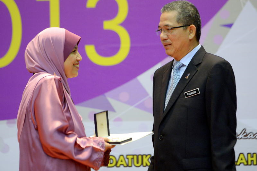 Fadillah (kanan) menyampaikan Anugerah Pingat Perkhidmatan Cemerlang (PPC) kepada Juruukur Bahan J54, Roznita Othman semasa Majlis Anugerah Perkhidmatan Cemerlang Kementerian Kerja Raya 2013 pada Selasa.