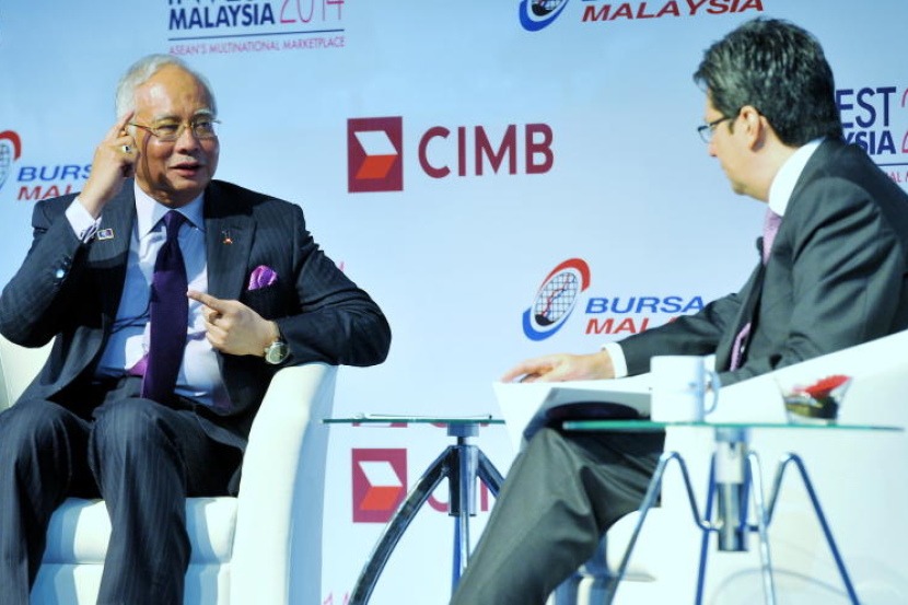 Najib menjawab pertanyaan Johan Raslan (kanan) selaku moderator pada sesi dialog bersama Perdana Menteri sempena 'Invest Malaysia Asean's Multinational Market Place 2014' di sini, Isnin.