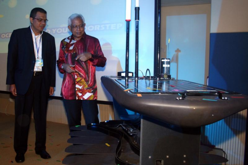 Dr Ibrahim Komoo (kanan) dan Johar melihat 'Wave Glider' pada Majlis Pelancaran 'Wave Glider' dan Majlis Menandatangani Surat Niat bersama ASMA di sini, Khamis.