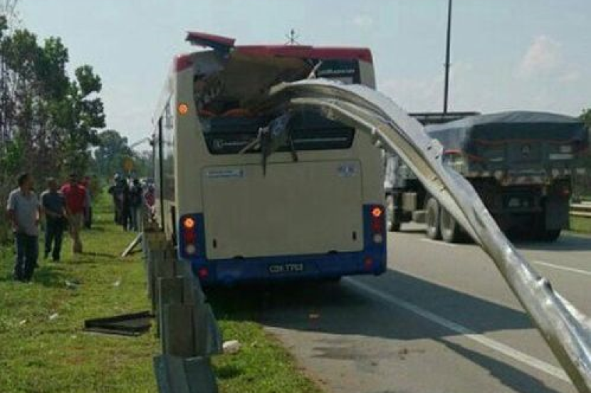 "Berikutan kejadian itu besi penghadang jalan dianggarkan sepanjang lima meter telah menembusi dari lantai sebelah kiri bas sehingga ke bahagian cermin belakang bas.
