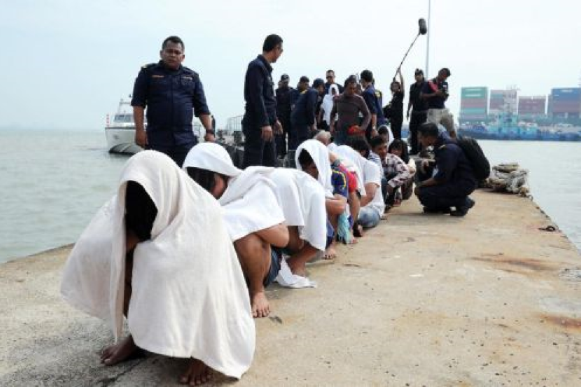Sebahagian daripada 18 pendatang asing tanpa izin (PATI) warga Indonesia yang berjaya diselamatkan selepas bot pancung yang mereka naiki terbalik di Beacon Api Gila, perairan Sepang, Khamis lalu. - fotoBERNAMA