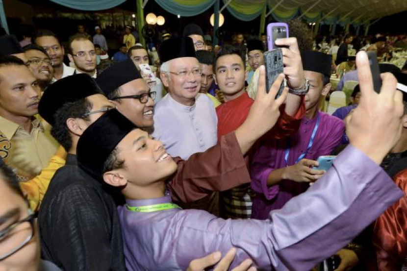 Para pelajar mengambil kesempatan untuk berselfie dengan Najib pada majlis berbuka puasa bersama pemimpin pelajar IPTA dan IPTS serta warga universiti di Seri Perdana, Putrajaya pada Selasa.-fotoBERNAMA