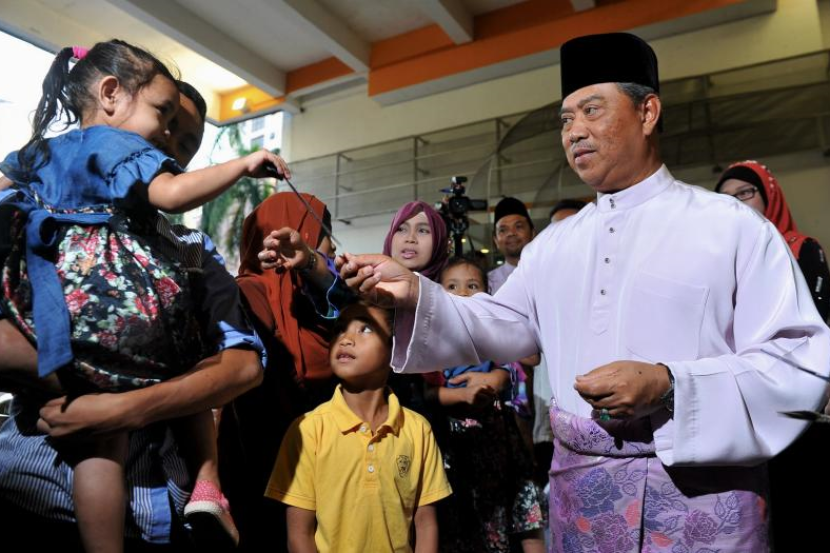Muhyiddin (kanan) menyampaikan bantuan duit raya kepada Nur Auni Safiya Jefri, 3, (kiri) pada majlis berbuka puasa bersama media di Balai Berita NSTP Jalan Bangsar di sini, malam Selasa.