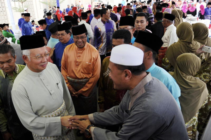 Datuk Seri Najib Tun Razak bersalaman dengan orang ramai semasa hadir pada Majlis Berbuka Puasa Bersama Rakyat Selangor di Masjid Tengku Ampuan Jemaah di Shah Alam pada Khamis. Turut hadir isteri beliau, Datin Seri Rosmah Mansor, Tan Sri Abdul Khalid Ibrahim dan Datuk Seri Noh Omar.