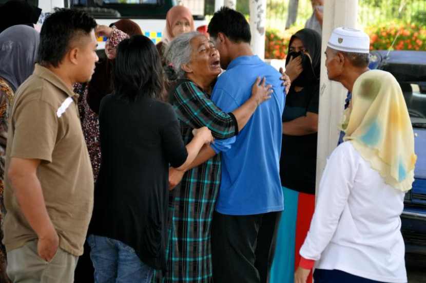 Ibu Koperal Ab Rajah Jamuan, Kamsiah Indanan (tiga, kiri) ditenangkan oleh ahli keluarga ketika menunggu di Hospital Tawau di sini, Ahad.