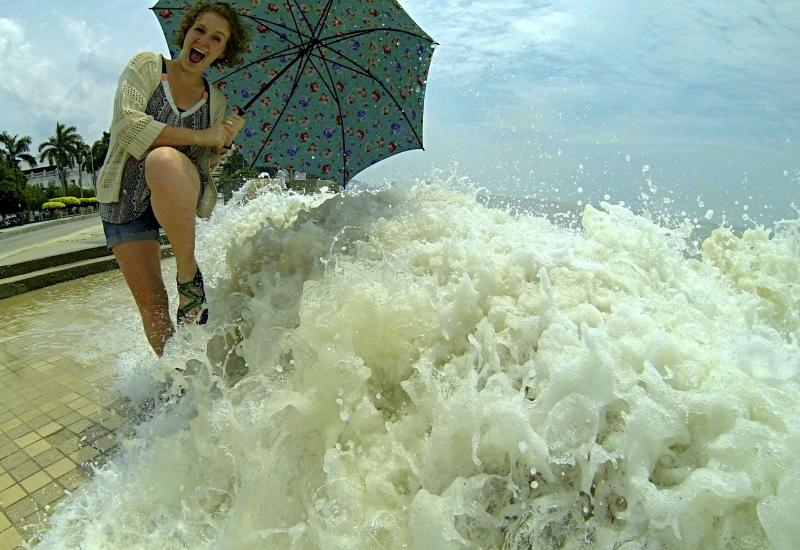 Pelancong, Rebekah Russell ceria apabila dipukul ombak di Esplanade