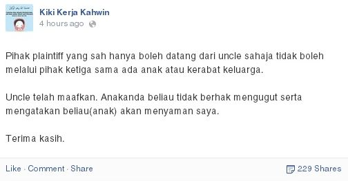 "Uncle already forgive me. Uncle did not lodge any police report. I haven't been interrogate by any police officer. (Pakcik sudah memaafkan saya. Pakcik tidak membuat apa-apa laporan polis. Saya tidak disol-siasat oleh mana-mana pegawai polis).