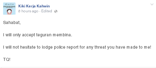 "That's not my intention. That's my personal mistakes and anger. Kerja Kahwin Sdn Bhd had nothing to do with my actions. I'm alone to be blame in this event. (Itu bukan niat saya. Ia adalah kesilapan peribadi dan kemarahan saya. Kerja Kahwin Sdn Bhd tidak mempunyai apa-apa kaitan dengan tindakan saya. Saya sahaja perlu dipersalahkan dalam hal ini)," katanya.