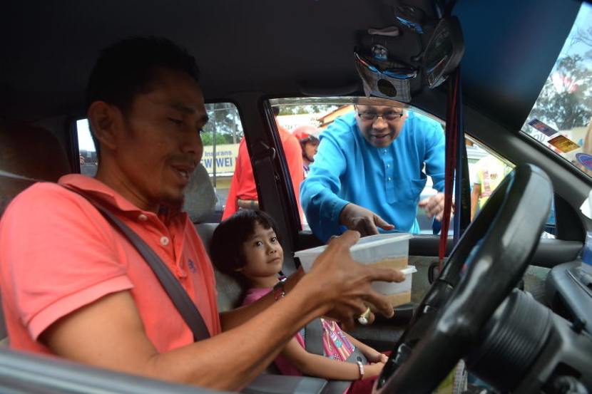 Ismail (baju biru) mengagihkan bubur lambuk pada Program Keselamatan Jalan Raya Bersama Ketua Pengarah JPJ dan Program Pengagihan Bubur Lambuk Kepada Pengguna Jalan Raya di sini, Rabu.