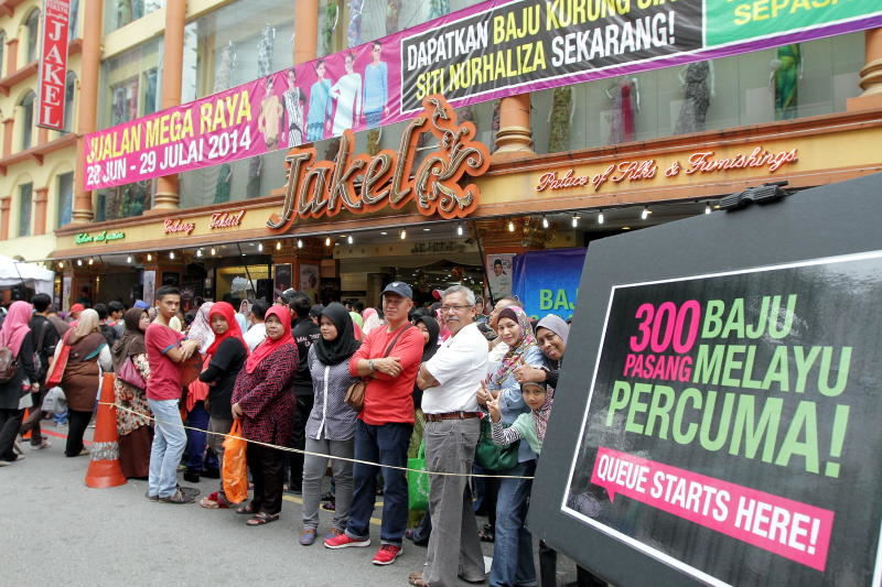 Jakel, sebuah syarikat tekstil gergasi di negara ini yang menganjurkan majlis Jom Beraya Bersama Aaron Aziz dan Zizan Razak turut menghargai pelanggannya dengan memberikan 300 pasang baju Melayu percuma kepada 300 pembeli pertama.