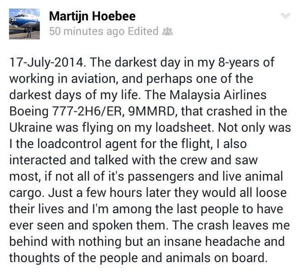 Meluahkan rasa sedihnya menerusi laman sosial Facebook (FB), Hoebee berkata, dia sedang bekerja apabila pesawat itu ditembak jatuh.