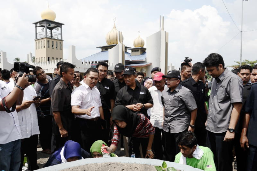 Muhyiddin (tengah) melihat kerja baik pulih telaga sambil diberi penerangan oleh Nazir Masjid Ar-Rahman, Rozaimi Roslan semasa meninjau kawasan masjid tersebut sempena Majlis Ihya Ramadan Khas di Sungai Manggis, Banting di sini, Selasa.