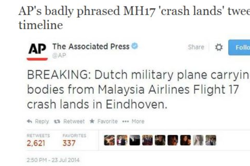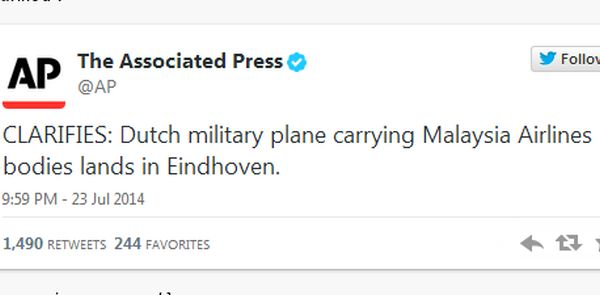 AP menyiarkan tweet “BREAKING: Dutch military plane carrying bodies from Malaysia Airlines Flight 17 crash lands in Eindhoven. (“TERGEMPAR: Pesawat tentera Belanda yang membawa mayat nahas Penerbangan Malaysia MH17 terhempas di Eindhoven”).