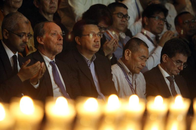Liow Tiong Lai (tiga, kiri) dan Ahmad Jauhari (dua, kanan) ketika hadir di majlis doa pelbagai agama untuk mangsa nahas MH17, Jumaat.