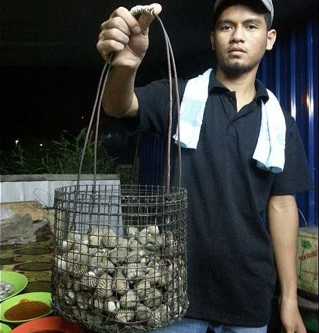 Salah seorang pekerja menunjukkan kerang rebus yang baharu diangkat dari dapur untuk dihidangkan kepada pelanggan.