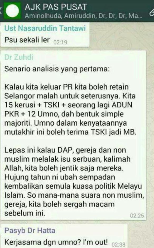 "Mereka menyambut usul keluar Pakatan Rakyat yang dicadangkan itu dengan ada yang menambah supaya mesyuarat PAS Pusat pada 10 Ogos akan datang hendaklah mendahulukan perbincangan usul ini daripada membincangkan kemelut isu Menteri Besar Selangor.