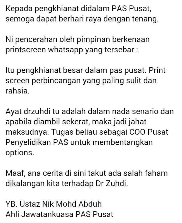 Jelas beliau, paparan skrin aplikasi WhatsApp yang seolah-olah menggambarkan seorang AJK PAS Pusat, Dr Mohd Zuhdi Marzuki sebagai penggerak disebalik cadangan berkenaan diambil dalam konteks yang tidak menyeluruh.