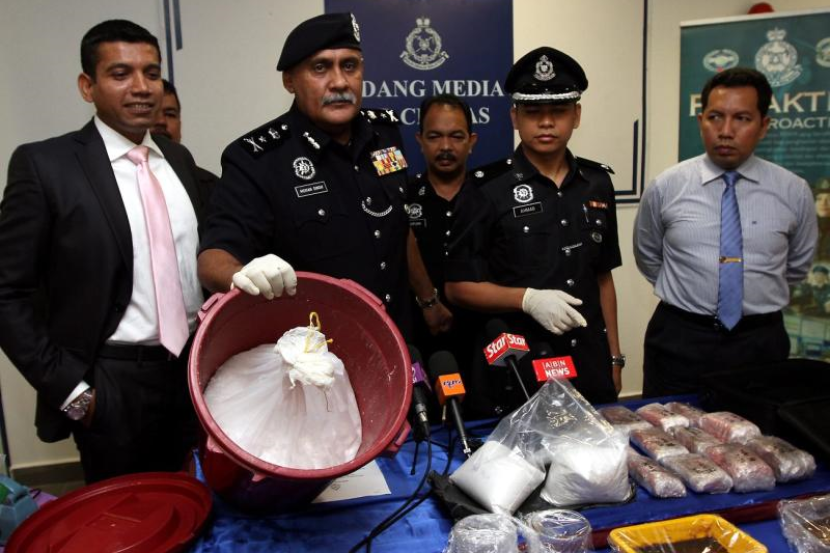 Mohan (dua kiri) menunjukkan dadah jenis syabu yang dirampas dari sebuah unit kondominium di Taman Sungai Besi, Kuala Lumpur pada Jumaat.