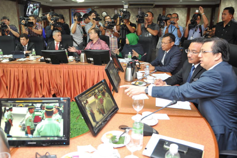 Liow dan Menteri Pertahanan, Datuk Seri Hishammuddin Tun Hussein melihat skrin raptai istiadat tentera semasa mempengerusikan mesyuarat Persiapan Menyambut Jenazah mangsa tragedi MH17 di Kementerian Pertahanan di sini, Khamis.