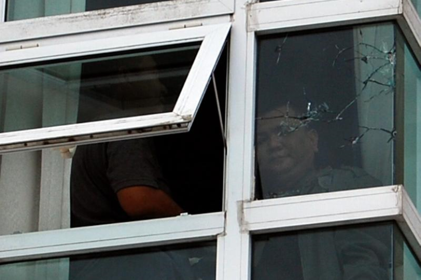 Anggota polis melakukan siasatan pada cermin yang pecah akibat dalam kejadian tembakan yang dilepaskan ke arah kediaman Wong di Jalan Ipoh, Sibu, baru-baru ini.