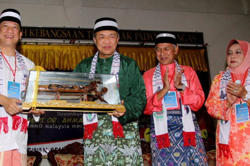 Ahmad Zahid menerima cenderamata dari Ketua Umno Bahagian Padang Rengas, merangkap Menteri Pelancongan dan Kebudayaan, Datuk Seri Mohamed Nazri Abdul Aziz (kiri) semasa hadir dalam Majlis Perasmian Mesyuarat Perwakilan Umno Bahagian Padang Rengas 2014 di SMK Tun Perak di sini,Ahad.