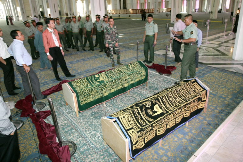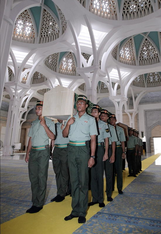 Anggota tentera melakukan upacara raptai di Masjid Jamek Kuching di Kuching, Khamis sebagai persediaan menerima jenazah mangsa nahas pesawat Malaysia Airlines MH17 yang dijangka tiba dari Amsterdam esok. Enam sekeluarga dari Sarawak iaitu Tambi Jiee, 48, dan isterinya Ariza Ghazalee, 46, bersama empat orang anak mereka, Muhamad Afif, 19, Mohd Afzal, 17, Marsha Azmeena, 15 dan Mohd Afruz, 13, terbunuh selepas pesawat MH17 yang dinaiki dipercayai ditembak jatuh di Ukraine, 17 Julai lalu.