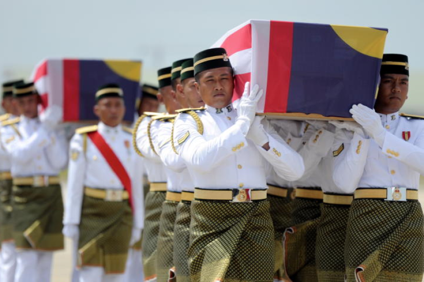Dua keranda mangsa nahas pesawat MH17, Ariza Ghazalee, 46, dan anak sulungnya Muhammad Afif Tambi, 19, diusung oleh anggota tentera sebaik sahaja dua jenazah itu tiba di Pengkalan Udara Tentera Udara Diraja Malaysia (TUDM) di Kuching, pada Jumaat.