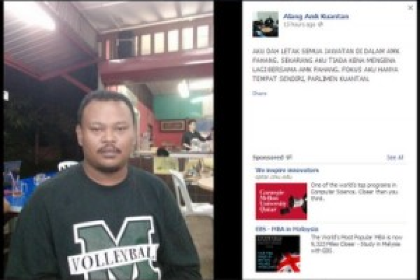 PETALING JAYA: Parti Keadilan Rakyat (PKR) memecat Ketua Angkatan Muda (AMK) Cabang Kuantan, Aidil Haryman Mat Nor kerana secara terbuka memaparkan gambarnya membakar bendera parti melalui laman sosial Facebook. Pengerusi Lembaga Disiplin parti itu, Dr Tan Kee Kwong berkata, tindakan itu diambil selepas pihaknya menjalankan siasatan dan menyoal pihak terbabit. “Dia sendiri mengakui bertindak membakar bendera parti dan mencabar agar dipecat daripada parti. “Tindakan ini memberi implikasi buruk kepada imej dan kredibiliti parti khususnya kepada masyarakat umum,” kata Kee Kwong menerusi kenyataan yang dikeluarkan Sabtu. Lembaga Disiplin juga meneliti dan menyiasat beberapa kes berkaitan tatatertib serta disiplin anggota dan membentangkannya dalam mesyuarat Majlis Pimpinan Pusat pada 22 Ogos 2014. Mesyuarat itu dipengerusikan Presiden PKR, Datuk Seri Dr Wan Azizah Wan Ismail serta anggota MPP lain. Selain Aidil Haryman, empat lagi anggota diberi surat tunjuk sebab dan digantung keanggotaan serta-merta sehingga siasatan selesai. Antara yang digantung ialah Dr Wan Suhaimi Wan Daud (Cabang Pasir Mas), Nasiruddin Mohamad (Cabang Sepang), Abdul Rahim Abdul Wahab (Cabang Selayang) dan Rosmah Suly dari Cabang Batu. Beliau berkata, mereka didapati terlibat dalam sidang media Pakatan Anak-Anak Selangor Menyokong Menteri Besar (Pasmeb) bersama badan bukan kerajaan (NGO) lain yang mempertahankan Tan Sri Abdul Khalid Ibrahim sebagai menteri besar Selangor pada 20 Ogos lalu.