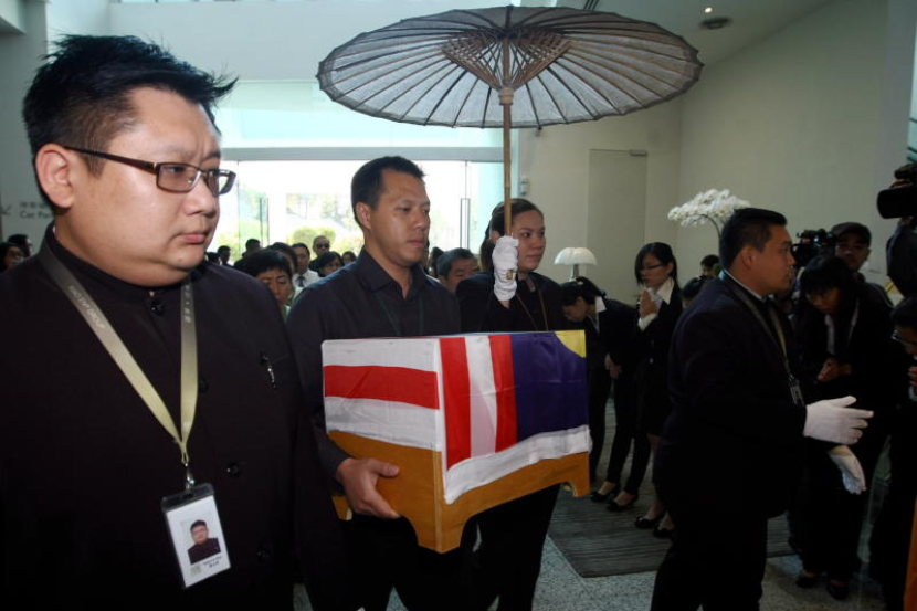 Kendi abu mendiang Ng yang dibaluti bendera Malaysia itu kemudiannya diiringi dua orang sami Buddha sambil dibacakan mantera mengikut adat dan kepercayaan agama itu.