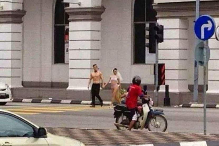 IPOH: Gambar separuh bogel pasangan pengantin yang dikatakan bergambar di hadapan sebuah bank Jalan Sultan Yussuf kini mula tersebar dan menjadi tarikan di laman sosial. Gambar tersebut menunjukkan pengantin wanita itu hanya memakai pakaian dalam dan vel pengantin, manakala pasangan lelaki tidak berbaju dan hanya memakai 'bow tie' serta seluar panjang bewarna hitam. Tidak dijelaskan bila penggambaran itu dibuat, namun gambar tersebut berada di laman sosial sejak Isnin. Pasangan pengantin itu kelihatan tidak segan walaupun ada pengguna jalan itu mengambil gambar mereka. Bagaimana pun, pengurus besar galeri perkahwinan yang hanya mahu dikenali sebagai Koo berkata, pasangan tersebut merupakan model dan hanya menjalankan penggambaran, bukan untuk berkahwin. Koo yang menguruskan penggambaran itu berkata, jurugambar biasanya lebih 'kreatif' dan amat terkejut dengan maklum balas di laman sosial. Katanya, dia sudah mengambil kira dari segi aspek undang-undang dan yakin ia bukan satu kesalahan. "Orang ramai terlalu 'berlebih-lebih' kerana mereka tidak pernah melihat wanita yang memakai bikini berjalan di tengah jalan sebelum ini. "Mereka ada hak untuk mengadu," jelas Koo sambil memberitahu sudah menjadi jurugambar profesional lebih 20 tahun. "Saya memilih lokasi ini kerana amat bersesuaian dengan tema dan konsep," tambahnya. Sementara itu, Ketua Polis Perak, Datuk Acryl Sani Abdullah Sani berkata, pihak belum menerima sebarang laporan, namun akan menyiasat perkara tersebut.