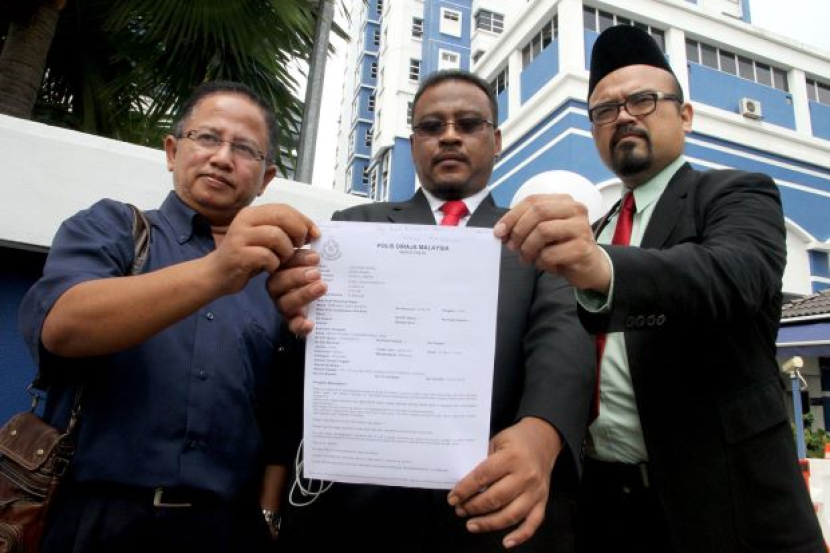 Mohd Khairul Azam (tengah) menunjukkan salinan laporan polis yang dibuat terhadap Khalid. Dia ditemani Ketua Penerangan Kelab Warisan Malaysia Zulkarnain Shaari (kiri) dan Pembantu Setiausaha Yayasan Bina Negara Ahmad Shafie Hambali.
