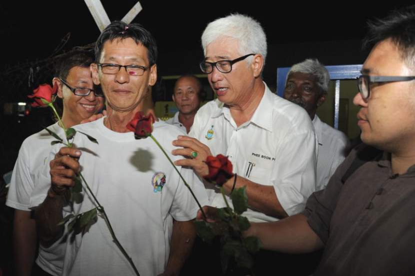 Pengerusi Jawatankuasa Kesihatan, Kebajikan dan Alam Sekitar negeri yang juga Pengerusi Pasukan Peronda Sukarela (PPS), Phee Boon Poh (dua dari kanan) memberi bunga ros kepada anggota PPS yang dibebaskan di Ibupejabat Polis Daerah Timur Laut di George Town, malam Isnin. Foto BERNAMA