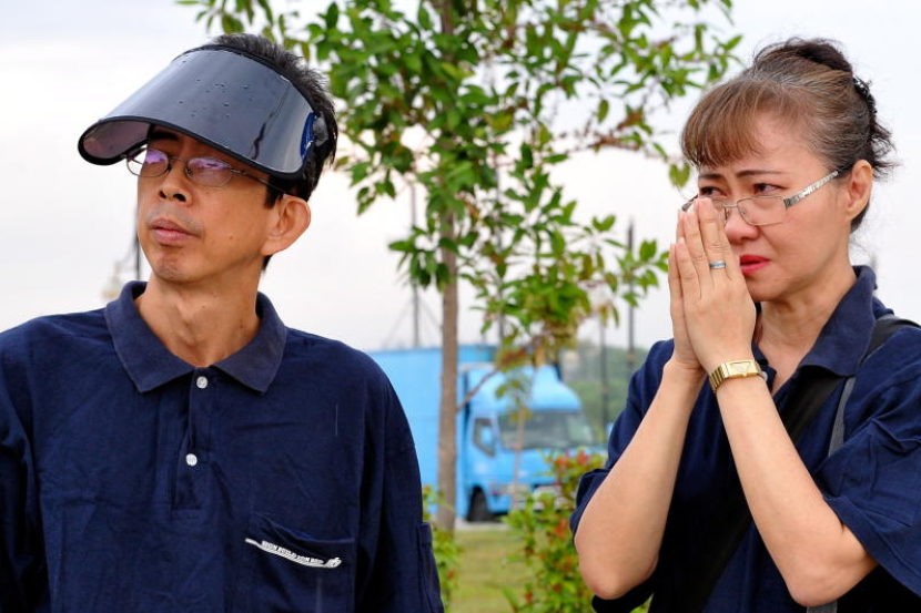 SEDIH … Lau Ai Lian, 46, bersama Jimmy Ang Sayyew, 52, yang merupakan penumpang setia MAS berdoa ketika menunggu kenderaan jenazah yang membawa keranda mangsa tragedi MH17 keluar dari Kompleks Bunga Raya Lapangan Terbang Antarabangsa KL (KLIA), Sepang pada Selasa.