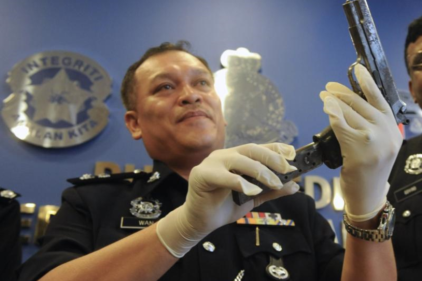 Wan Hassan menunjukkan pistol yang dirampas daripada anggota kumpulan kongsi gelap di Nibong Tebal.