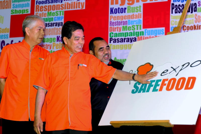 Dr Hilmi melekatkan abjad pada papan ketika merasmikan Expo Safefood, di sini, Sabtu. Turut kelihatan Pengarah Kesihatan Negeri Datuk Dr Ghazali Ohman (kiri)