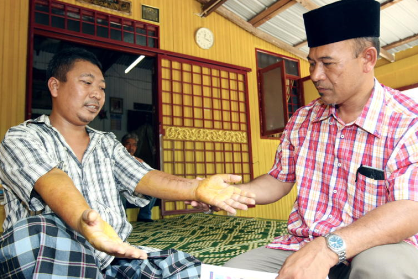 Calon Barisan Nasional (BN) bagi Pilihan Raya Kecil (PRK) Dewan Undangan Negeri (DUN) N.01 Pengkalan Kubor, Mat Razi Mat Ail (kanan) bertanya khabar kepada Fauzi Yusoff, 42, ketika mengadakan lawatan ke Kampung Bunohan.