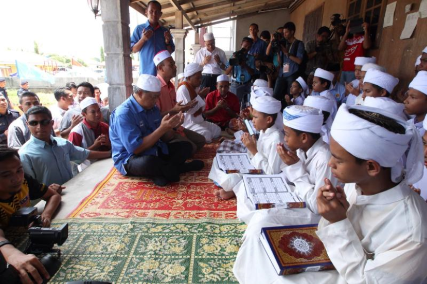 Muhyiddin ketika melawat pelajar Sekolah Pondok Kampung Simpangan yang diasaskan oleh calon BN, Mat Razi Mat Ail di Pengkalan Kubor pada Selasa.