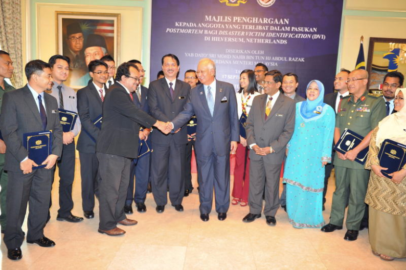 PUTRAJAYA: Perdana Menteri, Datuk Seri Najib Tun Razak pada Rabu menyampaikan sijil penghargaan kepada 19 rakyat Malaysia yang membantu mengenal pasti mangsa nahas pesawat Penerbangan Malaysia (MAS) MH17 di Belanda. Kalangan penerima termasuk pakar forensik daripada Kementerian Kesihatan, Angkatan Tentera Malaysia dan Polis Diraja Malaysia. Sijil yang ditandatangani perdana Menteri itu adalah untuk mengiktiraf jasa bakti dan sumbangan mereka dalam misi mengenal pasti jenazah nahas MH17 sebagai sebahagian anggota Pasukan Pengecaman Mangsa Bencana (DVI). Hadir sama pada majlis itu ialah Menteri Kesihatan Datuk Seri Dr S. Subramaniam dan Ketua Pengarah Kesihatan Datuk Dr Noor Hisham Abdullah. Pasukan DVI Malaysia telah membantu proses penandaan dan pemindahan jenazah mangsa nahas pesawat MH17 yang ditembak jatuh di timur Ukraine pada 17 Julai. Penerbangan MH17, yang membawa 298 penumpang dan anak kapal sedang dalam perjalanan dari Amsterdam ke Kuala Lumpur apabila ditembak jatuh. Selain 43 rakyat Malaysia, penumpang lain MH17 terdiri daripada warga Belanda, Australia, Indonesia, United Kingdom, Jerman, Belgium, Filipina, Kanada dan New Zealand. Ketua Pasukan DVI Malaysia, Dr Mohd Shah Mahmood berkata, pasukan DVI Malaysia mempunyai kemahiran yang setanding dengan pasukan forensik antarabangsa yang lain. "Kelebihan pasukan DVI Malaysia adalah kita mempunyai seorang pakar tulang yang menjadi rujukan kepada pasukan forensik antarabangsa. Tulang-tulang yang dijumpai akan dirujuk kepada pasukan DVI Malaysia," katanya. Sementara itu, Brig Jen Datuk Dr Mohd Ilham Haron yang terlibat dalam proses pengambilan mayat di tapak nahas di Ukraine dan proses pengecaman, berkata pasukan DVI Malaysia mendapat pengiktirafan dari pasukan DVI antarabangsa. "Kita telah membawa peralatan yang paling moden dan juga pakar yang berpengalaman ke sana untuk melakukan proses pengecaman. "Selain itu, cabaran terbesar adalah pasukan kami mempunyai had masa untuk melakukan proses pengecaman mangsa dan pada masa melakukan yang terbaik kerana satu dunia melihat kita melakukan proses pengecaman dan kecekapan kita," katanya.