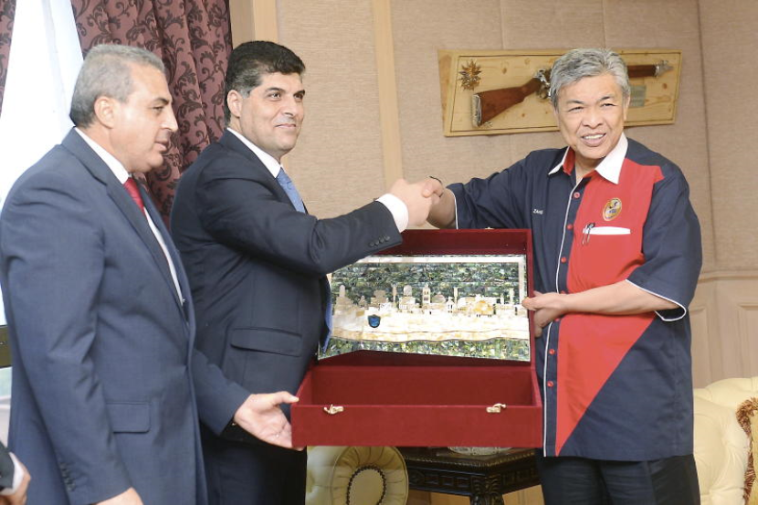 Ahmad Zahid Hamidi menerima cenderahati daripada Mejar Jeneral Hazim Attallah ketika menerima kunjungan Ketua Polis Palestin itu di pejabatnya di Kementerian Dalam Negeri (KDN) pada Khamis. Turut sama ialah Duta Palestin ke Malaysia, Dr Anwar Al-Agha (kiri).