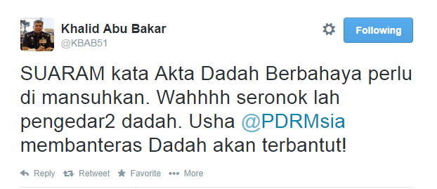 "Suaram kata Akta Dadah Berbahaya perlu dimansuhkan. Wahhhh seronoklah pengedar2 dadah. Usaha @PDRMsia membanteras dadah akan terbantut!"