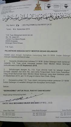 "Sukacita dimaklumkan bahawa Sultan Selangor telah berkenan melantik YB (Yang Berhormat) tuan untuk menjawat jawatan Menteri Besar Selangor berkuat kuasa 23 September (Selasa).