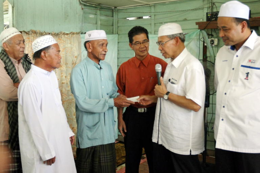 Mustapa (dua dari kanan) menyampaikan cek bantuan RM50,000 kepada Surau Haji Daud yang diwakili Imam surau tersebut, Mohamad Nor Daud (tiga dari kiri) di Kampung Tebing di sini, Isnin.