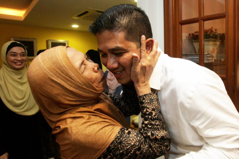 Azmin dipeluk ibu mertuanya,Siti Rahmah Ismail selepas dinamakan sebagai Menteri Besar Selangor yang baharu pada Isnin.