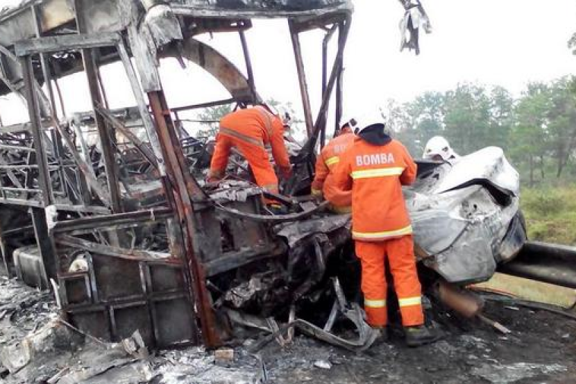 PEKAN: Sepasang suami isteri rentung apabila kenderaan yang mereka naiki terbakar selepas bertembung dengan sebuah bas persiaran dalam kemalangan di KM16 Jalan Pekan-Nenasi dekat Kampung Sungai Miang, Pekan pada Rabu.