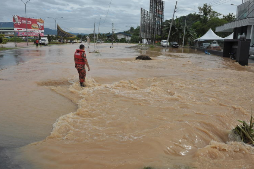 Anggota Bomba dan Penyelamat membuat pemantauan sekitar Pekan Donggongon Penampang ditenggelami banjir selepas hujan berterusan sejak dua hari lepas di sini, Selasa.