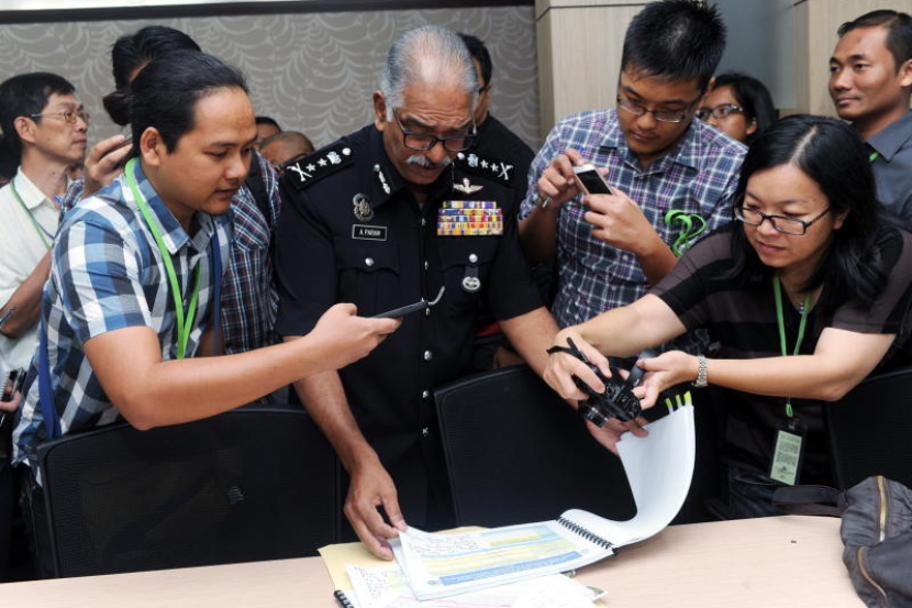 A.Paramasivam bersama wakil-wakil media pada sidang media bagi mengulas laporan sebuah akhbar tempatan mengenai 'isu Mafia di Kuala Sepetang' di Ibu Pejabat Polis Daerah Ipoh pada Selasa.